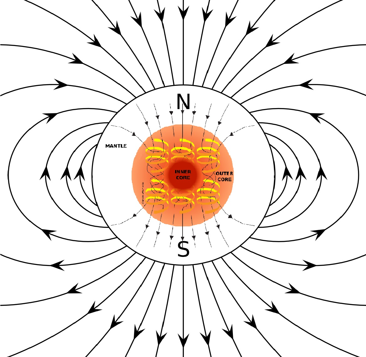 Геометрия магнитного поля Земли несовместима с идеей генерации магнитного поля планеты во внешней жидкой части земного ядра. Ошибочные общепринятые на сегодняшний день представления о железоникелевом ядре[6] возникли из понимания того, что плотность доступных для изучения на поверхности Земли горных пород недостаточна для обоснования существующей гравитации, а также того, что металлическое ядро может служить генератором магнитного поля нашей планеты (см. рис. 1, 2). Свидетельством достижения международным научным сообществом экстремального уровня консерватизма и, как следствие, массовой инертности мышления, является ошибка, допущенная в изображении механизма генерации магнитного поля Земли — на рисунке 1, который публикуется не одно десятилетие в авторитетных научных журналах[7][8], в энциклопедиях и в научно-популярных статьях[9], вектора магнитной индукции, генерируемые конвекционными потоками (завихрениями) расплавленного металла, которые размещённы в нижней части земного ядра, в нарушение правила буравчика, направлены вниз. Тогда как, генерируемый ими поток магнитной индукции должен быть направлен в противоположную строну (вверх), в результате чего геометрия потока векторов магнитной индукции должна существенно исказится.[2]