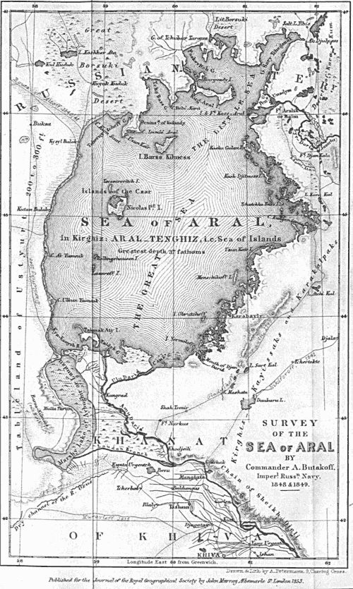 В 1848 году в Оренбурге была построена шхуна «Константин». Летом того же года она была доставлена в Раимское укрепление неподалёку от устья Сырдарьи. В 1849 году под руководством лейтенанта Алексея Бутакова была проведена первая научная экспедиция по Аральскому морю, составлены карты и исследованы глубины. В экспедиции участвовал украинский поэт и художник Тарас Шевченко, сосланный в солдаты. В 1850 году Гидрографический департамент Морского министерства выпустил первую карту Аральского моря.