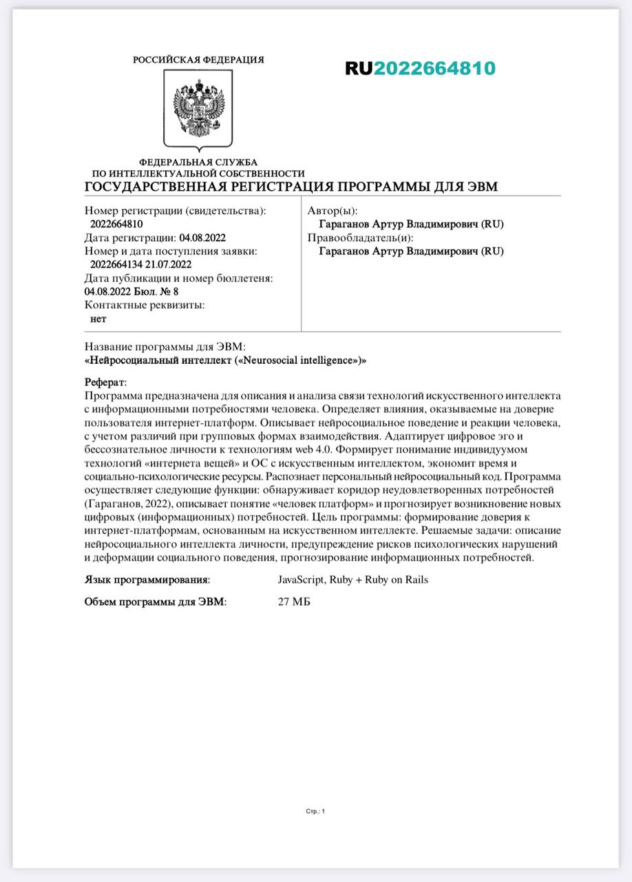 Авторские свидетельстваНЕЙРОСОЦИАЛЬНЫЙ ИНТЕЛЛЕКТ ДЛЯ ОПРЕДЕЛЕНИЯ ВОВЛЕЧЕННОСТИ В МЕДИАТРЕНДЫ И ДИАГНОСТИКИ СТЕПЕНИ ДОВЕРИЯ ИСКУССТВЕННОМУ ИНТЕЛЛЕКТУ. Автор: Гараганов А. В. RU2022613948, 3 марта 2022 г. Описание: Программа описывает зависимость медиаактивности и информационных потребностей человека, предназначена для мониторинга в различных коммуникативно-социальных средах, в том числе для замеров продолжительности следования за актуальным трендом, зависимость и вовлеченность. СИСТЕМА ОПРЕДЕЛЕНИЯ УРОВНЯ ДОВЕРИЯ ИСКУССТВЕННОМУ ИНТЕЛЛЕКТУ В ПРОСТРАНСТВЕ МЕТАВСЕЛЕННОЙ (A SYSTEM FOR DETERMINING THE LEVEL OF TRUST IN ARTIFICIAL INTELLIGENCE IN THE SPACE OF THE METAVERSE). Автор: Гараганов А. В. RU2022618526, 4 мая 2022 г. Описание: Программа предназначена для определения уровня доверия пользователей метавселенной к технологиям искусственного интеллекта. Определяет лояльность к продуктам и алгоритмам искусственного интеллекта, информирует об эффективности и безопасности использования ИИ, содействует научному обмену данными, устраняет риски непрозрачных решений ИИ в пространстве единой метаплатформы, мониторит доверие к СМИ, поддерживает обучение цифровым технологиям, анализирует информационные потребности личности и ее нейросоциальный интеллект. «НЕЙРОСОЦИАЛЬНЫЙ ИНТЕЛЛЕКТ („NEUROSOCIAL INTELLIGENCE“)». Автор: Гараганов А. В. RU2022664810, 21 июля 2022 г. Описание: Программа предназначена для описания и анализа связи технологий искусственного интеллекта с информационными потребностями человека. Определяет влияния, оказываемые на доверие пользователя интернет-платформ. Описывает нейросоциальное поведение и реакции человека с учетом различий при групповых формах взаимодействия. Адаптирует цифровое эго и бессознательное личности к технологиям web 4.0. Формирует понимание индивидуумом технологий «интернета вещей» и ОС с ИИ, экономит время и социально-психологические ресурсы. Распознает персональный нейросоциальный код. ПРОГРАММА СОЦИОЛОГИЧЕСКОГО ИССЛЕДОВАНИЯ ВЛИЯНИЯ ИНФОРМАЦИИ ИЗ СМИ НА ДОВЕРИЕ НАСЕЛЕНИЯ К ГОСУДАРСТВЕННЫМ ЦИФРОВЫМ ПЛАТФОРМАМ. (SOCIOLOGICAL STUDY OF THE IMPACT OF INFORMATION FROM THE MEDIA ON PUBLIC TRUST IN GOVERNMENT DIGITAL PLATFORMS). Автор: Гараганов А. В. RU2022680646, 27 октября 2022 г. Описание: Программа предназначена для исследования и анализа влияния средств массовой информации (интернет, телевидение, радио, печать, социальные сети, мессенджеры) на доверие населения к цифровым платформам. Программа позволяет замерять ведущий информационный канал получения информации для разных слоев населения, описывать субъективные факторы культуры доверия и недоверия в технологической сфере, определять отношение пользователей к цифровизации и ИИ. Программа анализирует регулярное взаимодействие пользователей с информационными системами как составными элементами цифровых онлайн-платформ, основанных на ИИ, учитывает нейросоциальный интеллект участников исследования. АВТОМАТИЗАЦИЯ ОБРАЗОВАТЕЛЬНОГО ПРОЦЕССА ДЛЯ РАЗВИТИЯ ЦИФРОВЫХ КОМПЕТЕНЦИЙ ПРЕПОДАВАТЕЛЕЙ И УДОВЛЕТВОРЕНИЯ ИНФОРМАЦИОННЫХ ПОТРЕБНОСТЕЙ СТУДЕНЧЕСКОЙ МОЛОДЕЖИ. Авторы: Гараганов А. В., Канюк А. С. 2023614547, 2 марта 2023 г. Описание: Программа создана с целью повышения эффективности реализации образовательных программ высшего и ДПО посредством внедрения психолого-педагогического сопровождения образовательного процесса и психологического просвещения его субъект
