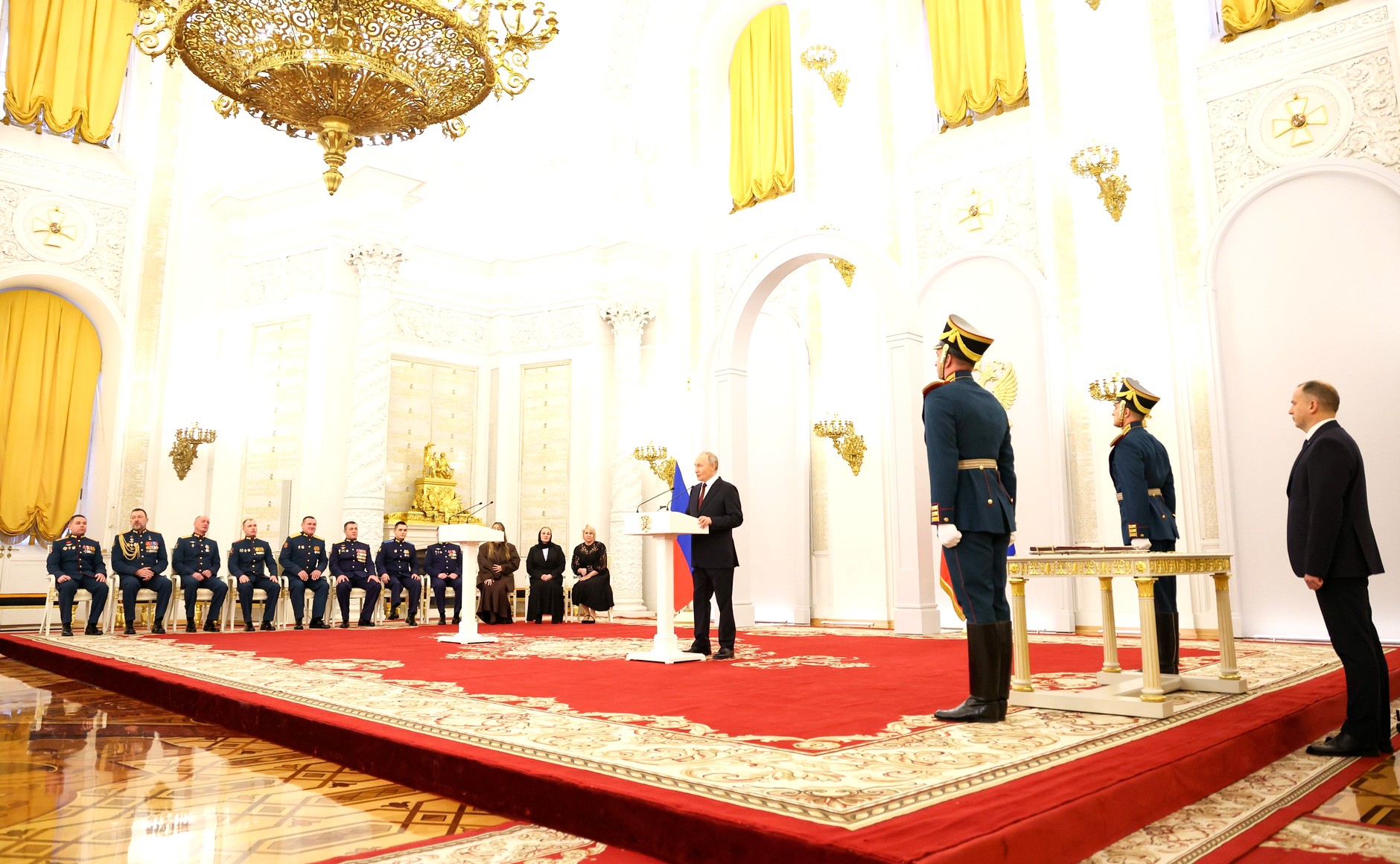 - ↑ «Показали пример самоотверженного служения Родине»: Путин вручил медали «Золотая Звезда» Героям России. RT (09.12.2024). Проверено 10 декабря 2024.