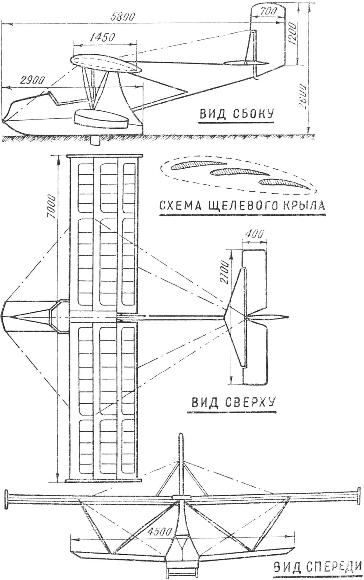 Щелевое крыло было сделано из трёх секций с хордой 300 мм, собранных по однолонжеронной схеме, с заполнением лёгким пенопластом всей передней части от лонжерона до носка. Каждая секция оклеивалась снаружи слоем тонкой стеклоткани на эпоксидной смоле для достижения водонепроницаемости. Между собой секции соединялись усиленными нервюрами, к средней из них крепился металлический башмак верхнего узла подкоса, соединяющего крыло с балкой.