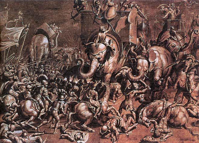 Однако римляне вскоре научились не только не бояться слонов, но и поражать их как шумом, который пугал этих животных, так и закидывая их дротиками. В результате слоны пугались и обращались на своих же. Гасдрубал Барка придумал способ быстрого умерщвления таких животных: