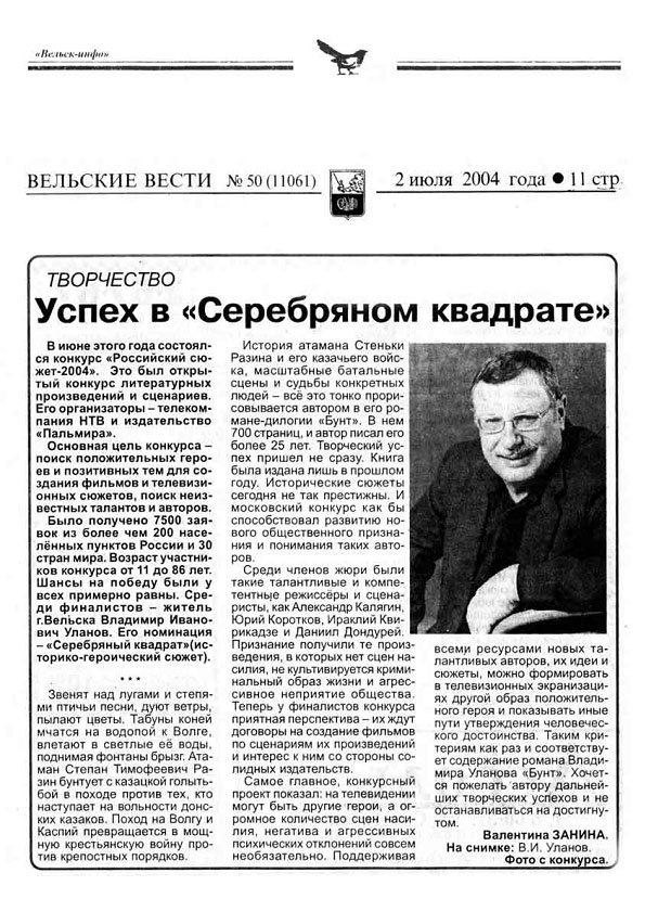 - Владимир Уланов. «Бунт». Роман. Книга вторая. Вельск «Вельская типография» 2006, 603 стр. тир. 3000