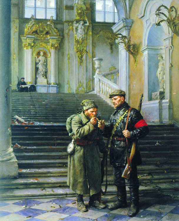 Историко-революционный жанр был представлен работами «И. В. Сталин среди рыбаков Енисея»[13] Виталия Вальцева, «Любимая песня Ильича» Якова Каплуна, «В. И. Ленин и крестьянские дети» Варвары Раевской-Рутковской, «Зимний взят» Владимира Серова.