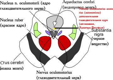 - ↑ Добавочное ядро третьего глазодвигательного нерва (ЧМН №III), оно же — ядро Якубовича.