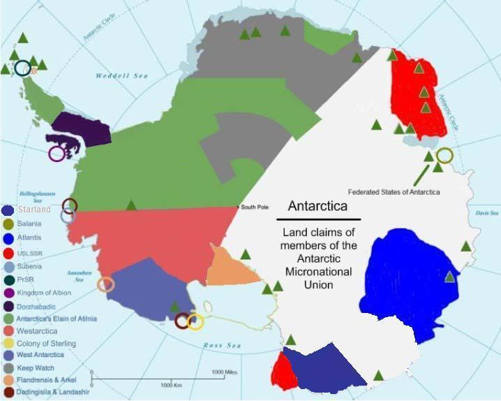 - Федеративные штаты Антарктиды (претендует на всю Антарктиду и часть Южного океана, состоит из 7 штатов и федерального округа; антарктические оазисы, свободные ото льда, рассматривает как свои анклавы).