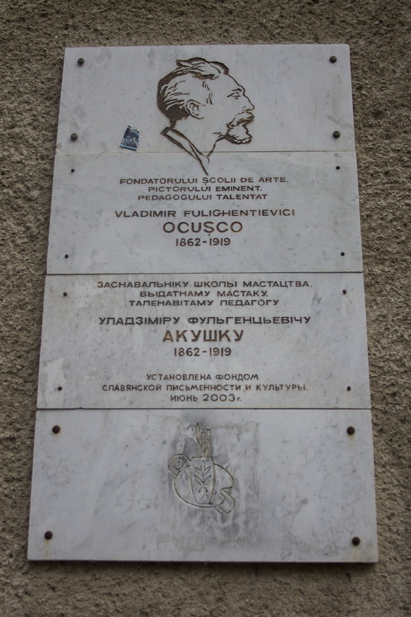 В память об основанном Владимиром Окушко художественном училище на здании, где оно сейчас находится, установлена мемориальная доска на молдавском и белорусском языках[2].