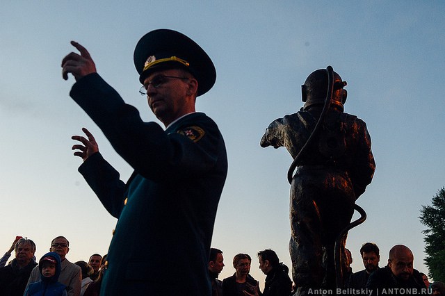 Открытие скульптуры сопровождалось дорогостоящей праздничной атрибутикой — военным оркестром[7], группой зрителей в военной форме и без, а кульминацией явилось хорошо отрепетированное появление из Москвы-реки двух настоящих водолазов, спешивших на открытие своего бронзового коллеги[1].