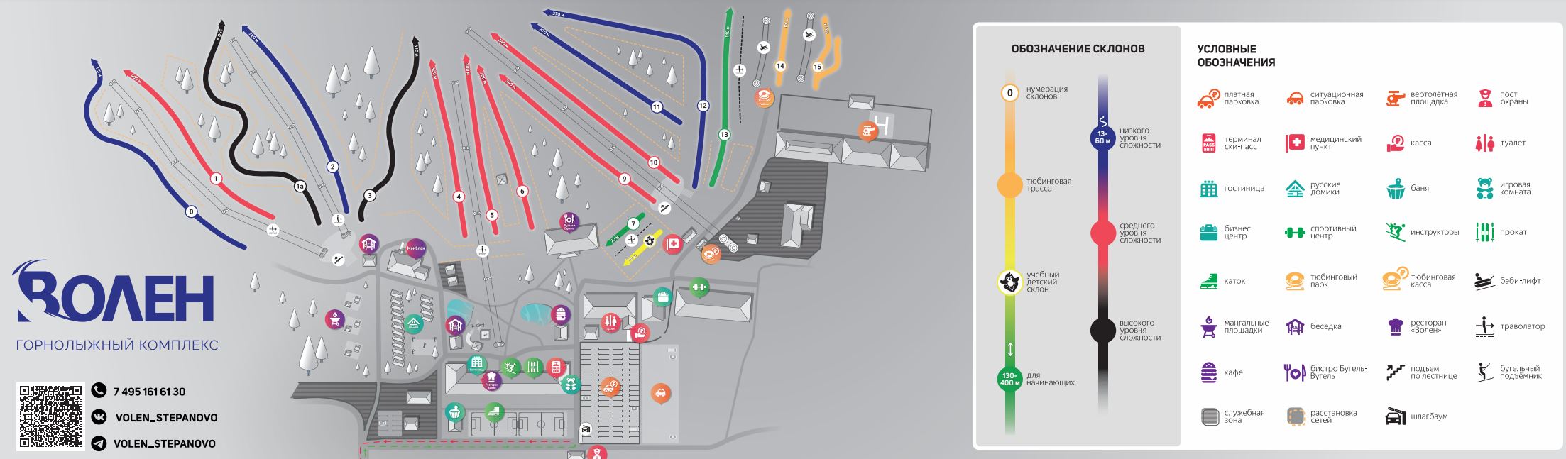 - Высота учебной трассы и трассы для тюбингов — 14 м.