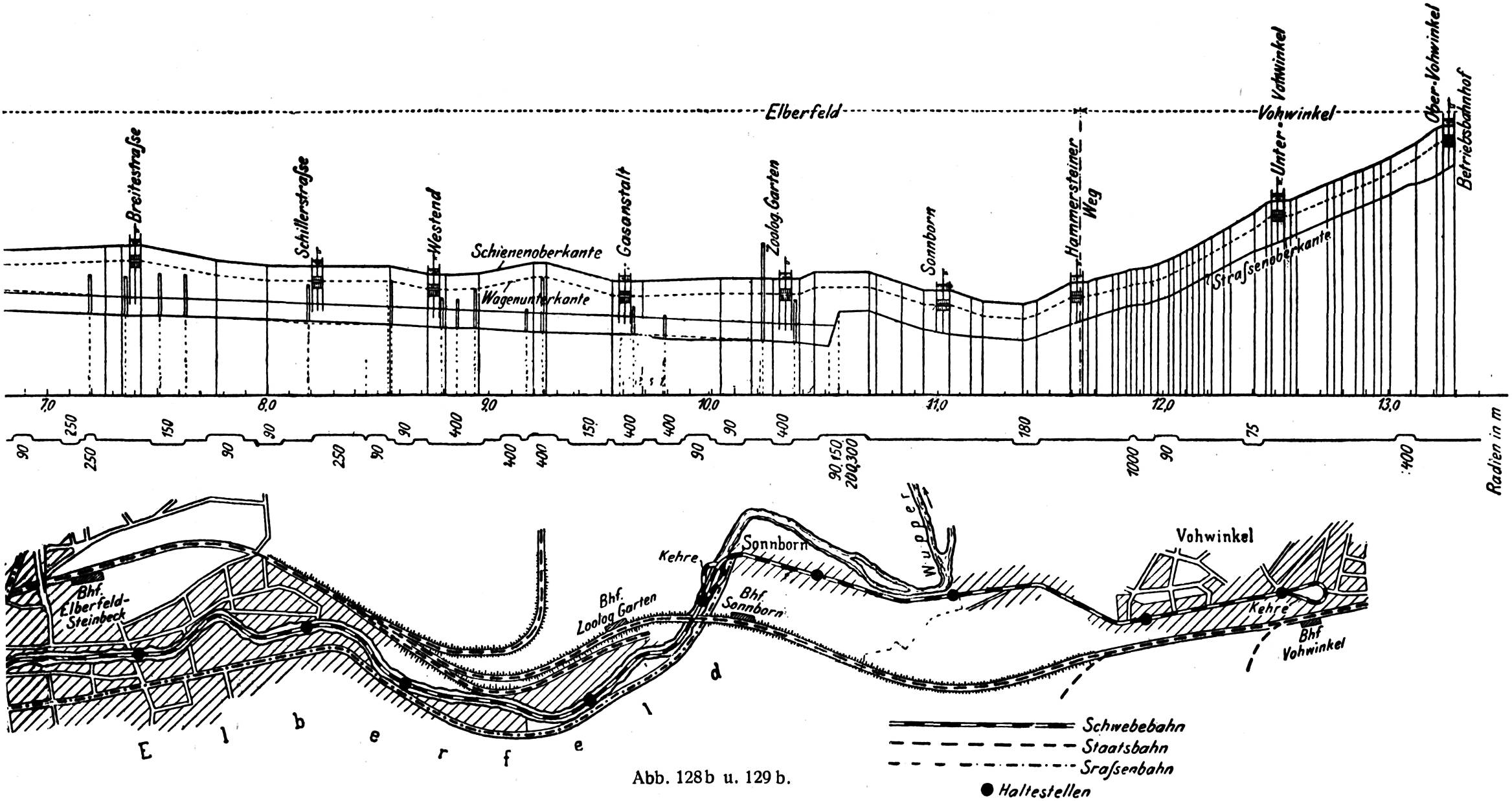 Первые 2,7 км от конечной остановки Vohwinkel Schwebebahn поезд следует по Vohwinkeler Straße, Kaiserstraße, Eugen-Langen-Straße и Sonnborner Straße. В конце он пересекает федеральную трассу 228 и затем следует по течению реки Вуппер на протяжении оставшихся 10,6 км. Наземный участок сухопутным маршрутом имеет значительный уклон: высоту 37,8 метра необходимо преодолеть на длине 2100 метров. Уклон достигает 27 ‰, а незадолго до конечной станции между опорами 8 и 5 составляет даже 40 ‰. Самая высокая точка на всем маршруте — конечная остановка в Вохвинкеле на высоте 180 метров над уровнем моря. Самая низкая точка верхнего края железной дороги — это переход с сухопутного на водный маршрут возле главной церкви в Зоннборне, где маршрут проходит на высоте 142 метра над уровнем моря. Подвесная железная дорога имеет два пути и эксплуатируется с правосторонним движением.