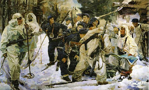 Весной 1942 года по инициативе ленинградского горкома ВКП (б) с художниками были заключены договора на выполнение работ, посвящённых Отечественной войне. Организация выставок была поручена военному совету ленинградского фронта и ленинградскому штабу партизанского движения. Были организованы передвижные выставки в госпиталях, воинских частях, фронтовых клубах, на переднем крае, а также работа художников на партизанских базах. Уже в июне 1942 года на открытой в большом зале ЛССХ выставке работ ленинградских художников на темы Великой Отечественной войны среди 300 работ 42 авторов были показаны первые произведения, выполненные в партизанских отрядах. После завершения выставки в августе 1942 года её работы самолётом были доставлены в Москву, где 4 октября В ГМИИ имени А. С. Пушкина открылась «Выставка работ ленинградских художников в дни Великой Отечественной войны».[35]