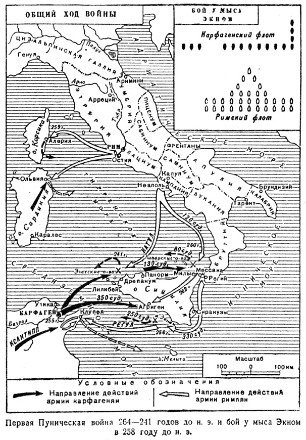 - ↑ Сражения на море в ходе Первой Пунической войны // Хлевов А. А. Морские войны Рима. «Издательский дом Санкт-Петербургского государственного университета». Санкт-Петербург, 2005.