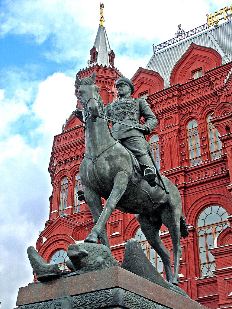 Георгий Константинович Жуков (19 ноября 1896, Стрелковка, Малоярославецкий уезд, Калужская губерния — 18 июня 1974, Москва) — выдающийся советский военный и государственный деятель, министр обороны СССР в 1955—1957 годах, Член Президиума ЦК КПСС в июне—октябре 1957 года. Маршал Советского Союза (1943). Четырежды Герой Советского Союза (1939, 1944, 1945, 1956). Кавалер двух орденов «Победа» (1974).