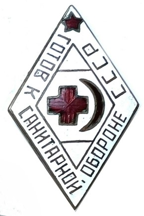 Знак «Готов к санитарной обороне СССР» — выполнен в форме ромба, покрыт белой эмалью. В центре эмблема Красного Креста и Красного Полумесяца, в верхнем углу красная эмалевая звёздочка. По краю проходит надпись: «ГОТОВ К САНИТАРНОЙ ОБОРОНЕ СССР». Изготовлен из бронзы. Создан в 1934 году. Существовал вариант с двумя углами, покрытыми синей эмалью[14]. |