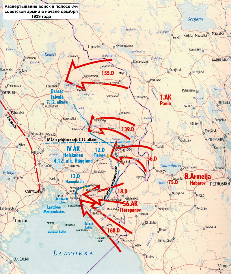 Одной из шести армий выставленных против Финляндии была 8-я армия, имевшая в своём составе шесть стрелковых дивизий, по другим данным, армия состояла из двух корпусов — 1-го корпуса (включал 155-ю и 139-ю стрелковые дивизии) и 56-го корпуса (включал 18-ю, 168-ю стрелковые дивизии и 34-ю танковую бригаду).