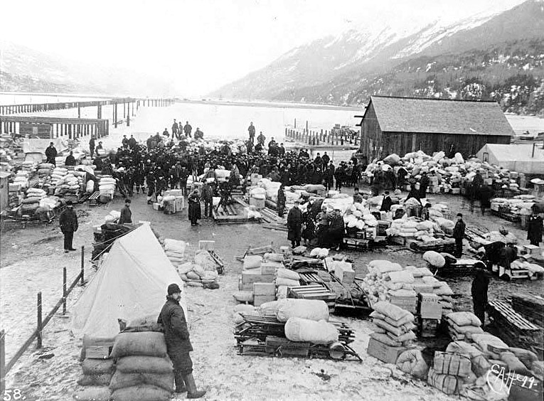 ...хаос на берегу Дайи, загроможденном тысячами фунтов снаряжения, принадлежавшего тысячам мужчин. Эта невероятная масса грузов и провизии, сброшенная с пароходов на берег, медленно просачивалась вверх по долине Дайи и далее через Чилкут. Путь составлял двадцать восемь миль, и груз можно было переносить только на себе. Индейские носильники, поднявшие расценки с восьми центов за фунт до сорока, не справлялись с работой, и стало ясно, что зима может застать большую часть поклажи по эту сторону перевала.