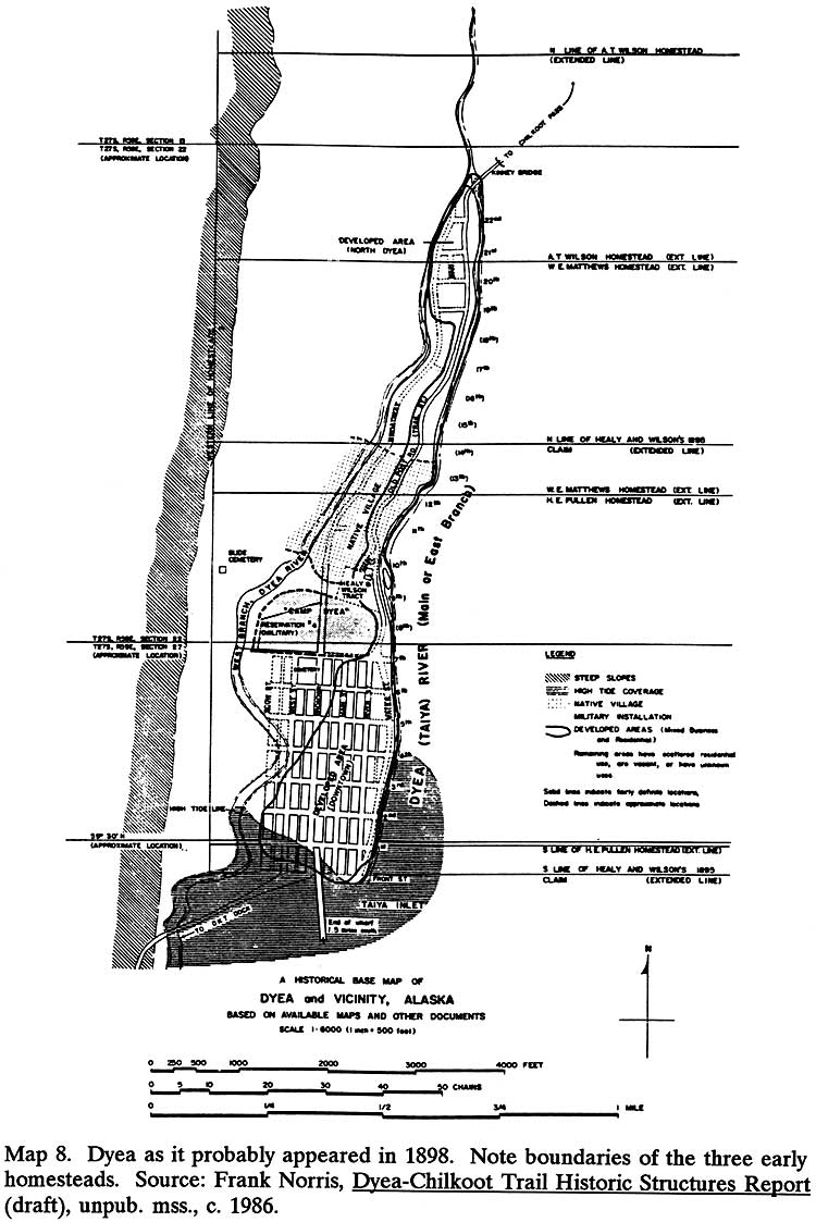 - ↑ 18,0 18,1 Administering the Dyea Area. National Park Service (24-Sep-2000). Проверено 2 серпня 2020.