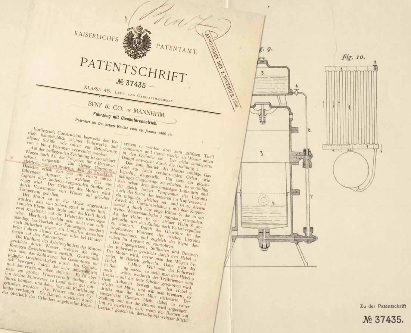 29 января 1886 года в Берлине (Германия) Карл Бенц подал заявку на получение патента на изобретённый им трёхколесный автомобиль Benz Patent-Motorwagen, который работал на бензине. Машина представляла собой двухместное транспортное средство на металлических оспицованных колёсах[2]. Она считается первым коммерчески доступным автомобилем с двигателем внутреннего сгорания[1], а выданный патент № 37435 — свидетельством о рождении первого автомобиля[3]. Этот документ включён в международный реестр документального наследия ЮНЕСКО «Память мира»[4].