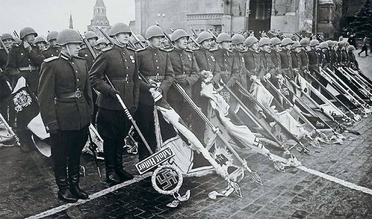 24 июня 1945 года за два часа до начала парада 200 солдат сводного батальона построились у собора Василия Блаженного, куда на крытых грузовиках привезли трофейные знамёна, отобранные специальной комиссией.