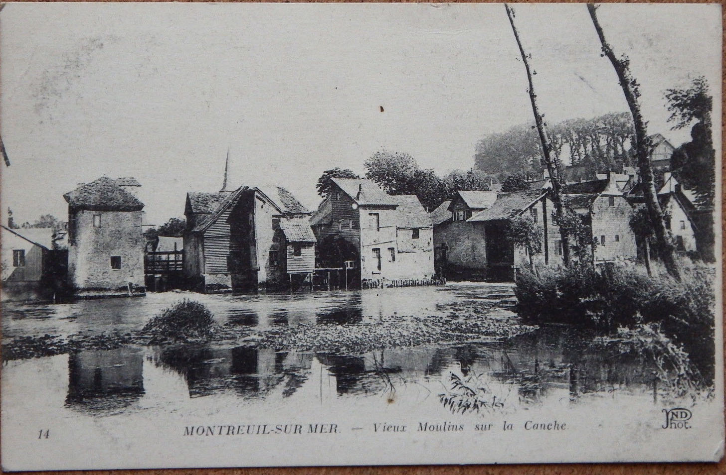 Однако впоследствии возникли сомнения в верности определения сюжета как приморской гавани — в 1910 году в северных районах Франции было большое наводнение и на картине определённо показаны притопленные основания домов; стилистические особенности картины также свидетельствуют в пользу её создания в 1910 году. В собрании Народной галереи в Праге находится этюд к эрмитажной картине (холст, масло; 37,5 × 46,2 см; инв. № O 8032)[3], на обороте этого этюда рукой Дерена сделана надпись «Montreuil-sur-Mer» — это помогло локализовать местность, изображённую на картине. Окончательно все вопросы с определением сюжета были сняты, когда была обнаружена почтовая фотооткрытка, выпущенная в начале XX века, на которой изображено то же самое место в абсолютно идентичном ракурсе. Тогда же стало ясно, что изображены не подтопленные дома, а старинные водяные мельницы на речном берегу — об этом прямо говорится на оригинальной подписи открытки («Vieux Moulins sur la Canche» — «Вид мельниц на Канше»). А. Г. Костеневич высказывает осторожное предположение, что Дерен возможно был знаком с этой почтовой карточкой: он «точно воспроизвёл все пропорции домов и расстояния между ними и сохранил те же светотеневые соотношения. Разница же состоит в том, что, воссоздавая натуру, он при всей точности и достоверности, выстраивал собственную кристаллическую структуру, чему способствовали и отражения на разлившейся воде» и далее говорит, что оба пейзажа, пражский и петербургский, Дерен мог написать и в своей парижской мастерской по фотографии[4]. По сравнению с фотографией на эрмитажном варианте картины Дерен существенно срезал снизу водную поверхность и по левому краю вообще убрал одно из строений. На пражском эскизе, наоборот, снизу увеличена водная поверхность и виден край левого строения, но при этом существенно обрезан правый край, так что отсутствуют тополиные стволы переднего плана.