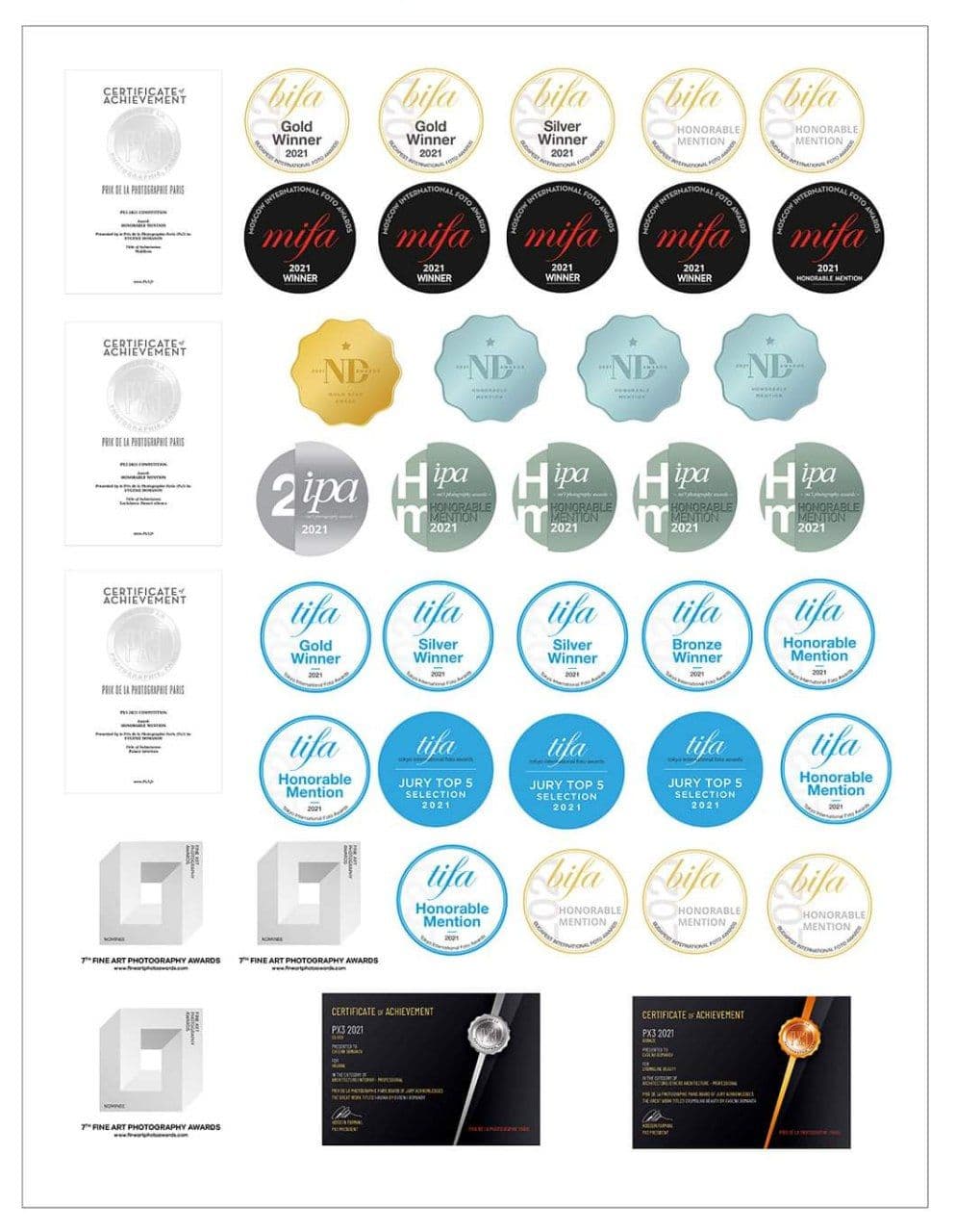 - золотые, серебряные и бронзовые медали и выбор жюри на международном конкурсе TIFA 2021[20];