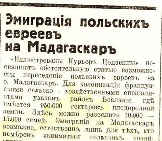 В 1937 году, спустя 2 года после смерти основателя независимой Польши Юзефа Пилсудского, осуждавшего антисемитизм, правительство Польши создало комиссию, перед которой была поставлена задача выяснить приемлемость плана насильственного выселения польских евреев на Мадагаскар. В Варшаве рассчитывали на то, что создание с согласия Франции в форме еврейского автономного образования на острове укрепит международные позиции Польши. Однако польская правительственная комиссия, посетив Мадагаскар, пришла к заключению, что климатические условия на острове неблагоприятны для жизни польских евреев. Такого же мнения придерживался французский губернатор Мадагаскара[23].