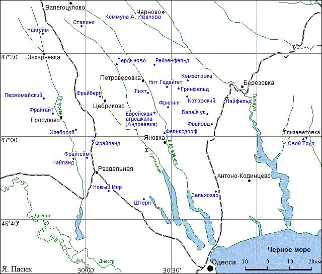 | Колонии в окрестностях м. Петроверовка (Зиновьево, "Равенство и Братство", Троцкое или Троцк) | N 47°13'48", E 30°20'24" | Село Петроверовка (б. Жовтень) Петроверовского (б. Жовтневого) сельсовета Ширяевского района Одесской области |