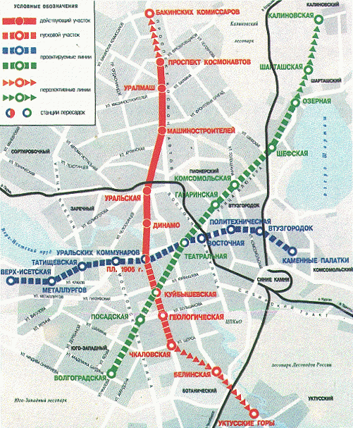 Проспект Космонавтов • Уралмаш • Машиностроителей • Уральская • Динамо • Площадь 1905 года • Геологическая • Чкаловская • Ботаническая |