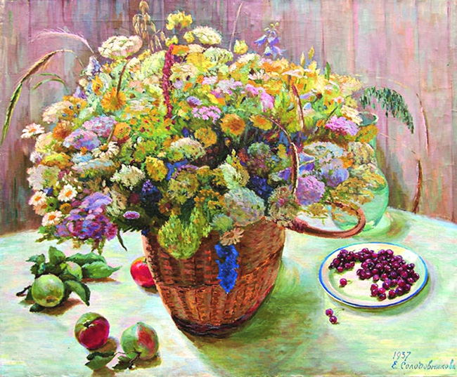 Среди основных произведений, созданных Е. Солодовниковой в станковой живописи, картины «Цветы и фрукты» (1937), «Натюрморт»[3] (1950), «Портрет химика О. С. Домбровской»[4] (1954), «Горные цветы»[5] (1972), «Весна»[6] (1975) и другие.