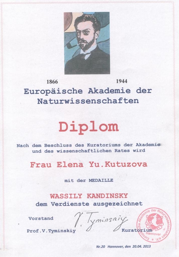 - Медаль Василия Кандинского от Европейской Академии Естественных Наук за особый вклад в мировое изобразительное искусство (2013)