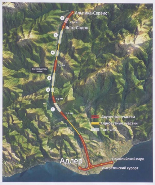 16 августа 2010 года официально введен в строй первый участок железной дороги длиной 6 км, который расположился в Имеретинской низменности Адлера. К ноябрю 2010 года завершены работы по проходке 2 железнодорожных туннелей между Адлером и Красной Поляной.