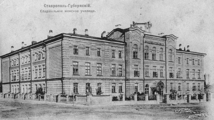 В 1887 году на северо-востоке Софиевской площади города Ставрополь-Кавказский (название Ставрополя до 1935 года) на улице Невинномысской было возведено трёхэтажное здание епархиального женского училища в стилистике классицизма, широко использовавшейся при строительстве гимназий Российской империи во второй половине XIX века[5][6].
