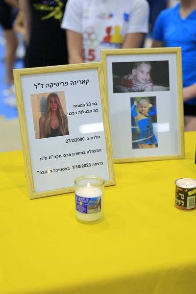 Церемония памяти на Летнем Кубке по групповым упражнениям памяти гимнастки Маккаби из Петах-Тиквы — Карины Притика, убитой 7.10.23 на вечеринке Нова.