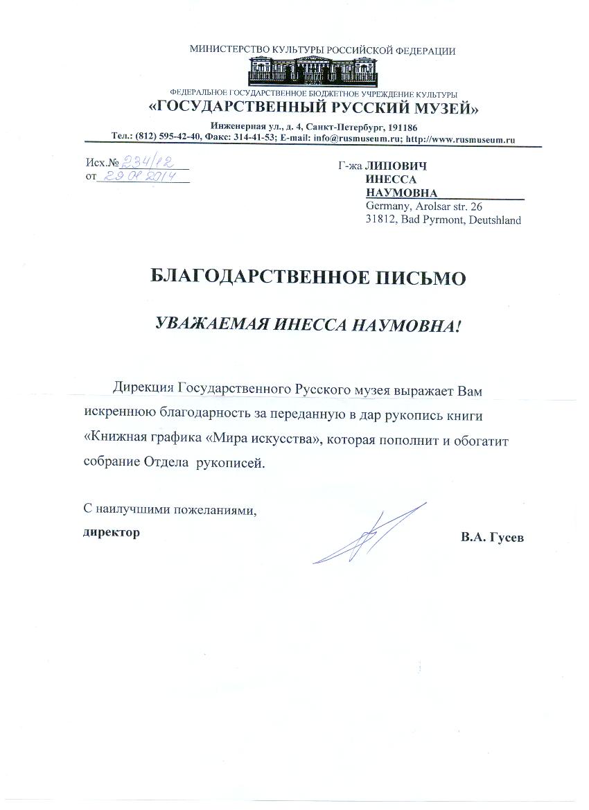 "Уважаемая Инесса Наумовна! Дирекция Государственного Русского музея выражает Вам искреннюю благодарность за переданную в дар рукопись книги «Книжная графика „Мира искусства“, которая пополнит и обогатит собрание Отдела рукописей.»