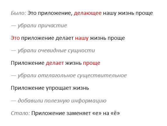 Достигается посредством ряда приёмов редактирования, в результате которых текст становится лаконичным, честным и полезным.
