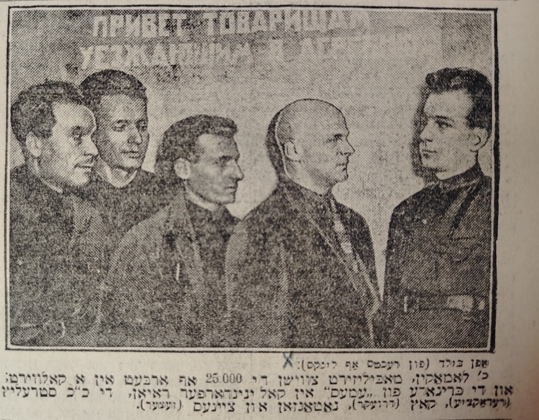 Фото опубликовано вместе со статьёй Л.О. Натанзона, где рассказывается о том, как на собрании коллектива была сформирована эта бригада, и как их потом провожали и напутствовали: от лица газеты «Дер Эмес» – ответственный редактор М.И. Литваков (он подчёркивал, что в еврейской деревне посланцам пролетарской Москвы придётся бороться с «чисто националистическим подходом еврейского кулака, что “все евреи братья”») и председатель месткома редакции, журналист, историк и библиограф А.Д. Киржниц, оба активные деятели ОЗЕТ (Общества землеустройства еврейских трудящихся) и вообще первые лица тогдашнего советского еврейского сообщества; от типографии – секретарь партячейки И.Ш. Файнштейн и председатель завкома тов. Захаров.