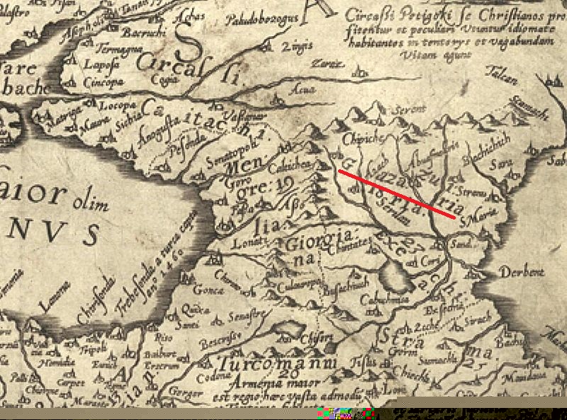 С юга же к Комании прилегают Аланы, Чиркассы, Хозары (Gazaros), Греция и Константинополь, также земля Иберов, Кахи, Брутахии, которые слывут иудеями - они бреют голову, - также земля Цикков, Георгианов и Арменов и земля Турков. А с запада прилегают Венгрия и Руссия.