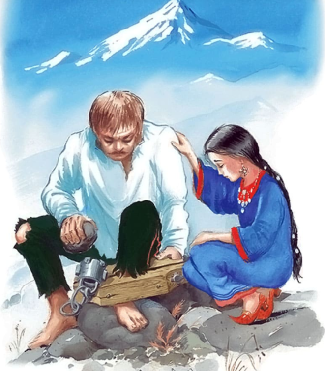 Кавказские пленники уже месяц прибывали в ауле Абдул-Мурата. У Жилина были мастеровитые руки и он быстро научился из глины делать куклы. И дарил их хозяйской дочке Дине. В знак благодарности девочка тайком приносила ему лепешки с молоком. Потом Жилин достал кое-какие инструменты и стали ему в починку вещи приносить.