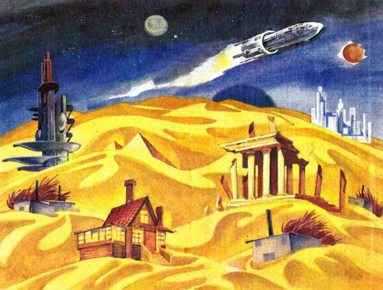 Из диалогов персонажей становится понятно, что они улетели с Земли в разгар войны. Уильям слушает атомное радио, и в какой-то момент оно замолкает. Он предлагает сыновьям выбрать город, в котором они теперь будут жить.
