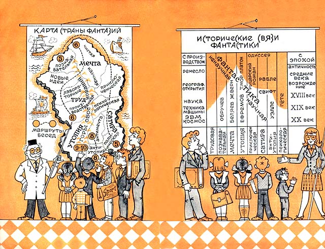 «Слева Страну Фантазий омывает океан Научный, справа - Литературный. На границе двух океанов лежит область Познавательной фантастики, рядом с ней, но ближе к литературе - Приключенческая фантастика, за ней обширный край Мечты. Ближе к приключенцам - Мечта о готовых открытиях, а ближе к ученым - Мечта о созидании, Лабораторная и Производственная. Мечта же о человеке и обществе будущего, то есть Утопия, глубоким морем Споров отделена от берега Осуждающей фантастики с областями Сатиры на отсталое общество, Сатиры на отсталых современников и Сатиры на неверные тенденции и мечты. Последняя имеет свое название: Антиутопия, или Фантастика Предостережения. На перешейке между Мечтой и Сатирой расположил я Психологическую фантастику - изображение современного человека средствами фантастики. За фантастикой Лабораторной виднеется далеко вдающийся в океан Науки полуостров Новых Идей, а близ него область очерков о Технике Будущего. И против каждой области, уже за морем, я изобразил аналогичные разделы нефантастической литературы, или ненаучной фантастики.»