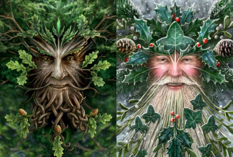 Общим местом для неоязычников с целью наполнения этих дат мистическим смыслом, является осмысление их как важных переходов в борьбе двух аспектов «Зелёного человека» — Великих владык природы («Древесных королей») — Короля Дуба и Короля Падуба (Остролиста), основанное на спекулятивных рассуждениях исследователей европейского фольклора (теория «Золотой ветви»), начиная с Роберта Грейвса (и его книги «Белая богиня» от 1948 года). Гипотеза Грейвса была позаимствована новыми европейскими культами как основная для образного осмысления календарной цикличности. По мнению теоретиков этой концепции, каждому королю принадлежит по половине года: над тёмной половиной властен Король Падуб, над светлой — Король Дуб. В извечном противостоянии этих королей и вращается круг времени со сменой сезонов. Летнее солнцестояние — умерщвление молодым Королём Падубом своего соперника, зимнее солнцестояние — победа Короля Дуба. В построениях виккан идею двух королей параллельно дополнили сюжеты о символических любовных взаимоотношениях двух других персонажей — основополагающих в этой конфессии — Рогатого Бога и Богини-Матери.