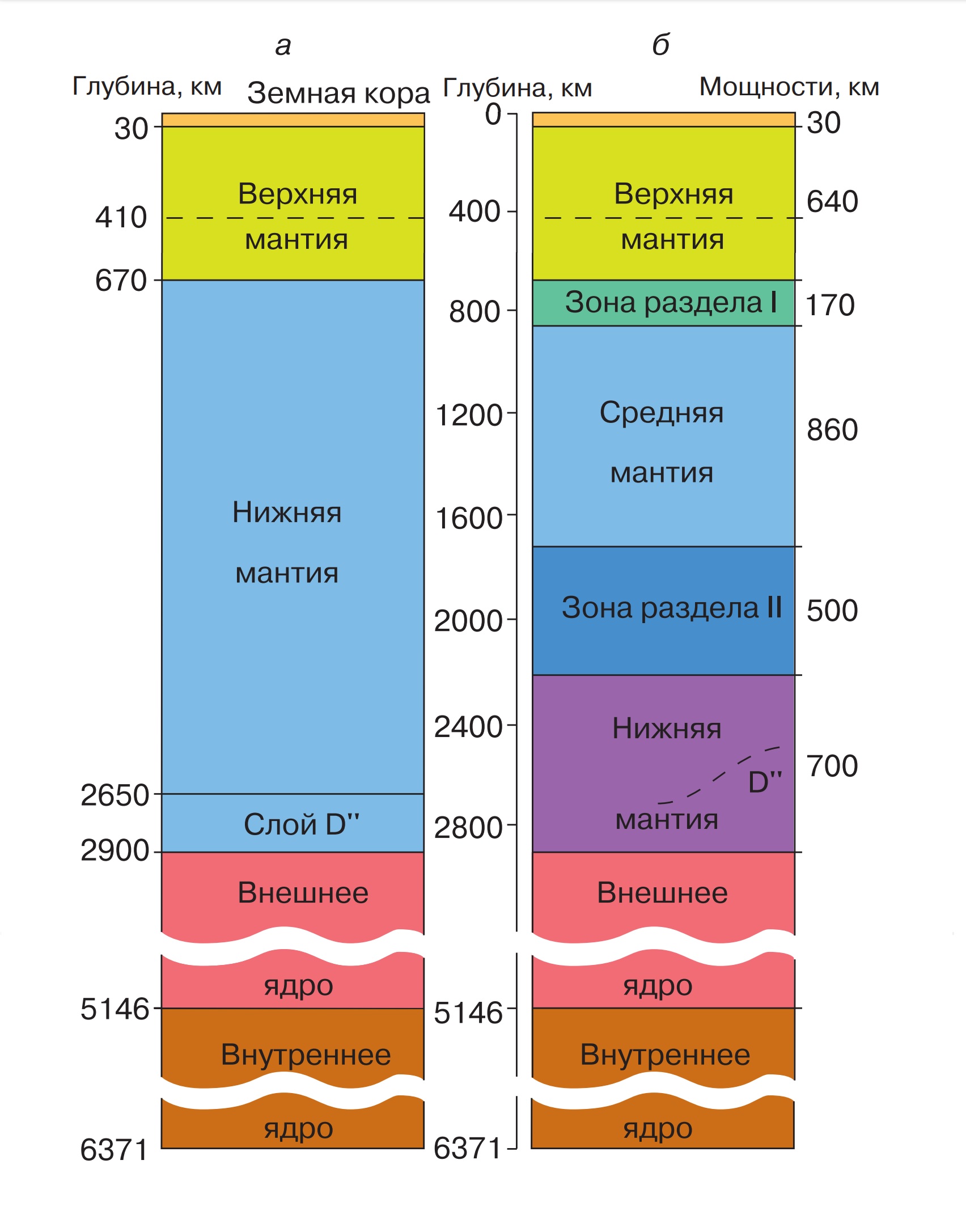 - мантия имеет слоистую структуру (см. рис. 23) [48], а значит, вертикальный градиент температуры в недрах планеты меньше или равен адиабатическому градиенту температуры; в этих условиях процесс циркуляции мантийного вещества невозможен, поскольку механизма, который мог бы обеспечить дрейф литосферных плит, не существует;