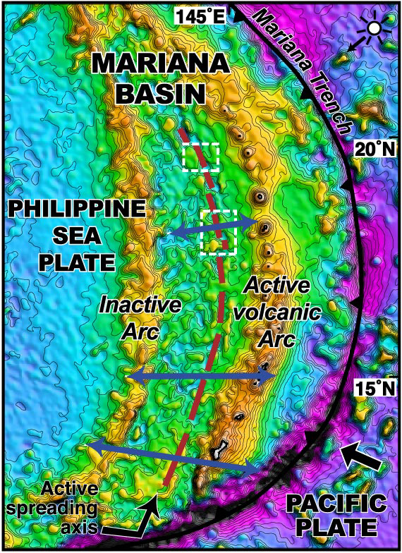 - в настоящее время эта зона спрединга[63] Марианского дугового бассейна продолжает расширяться, причём скорости расширения в противоположных направлениях от линии разлома не одинаковые[64];