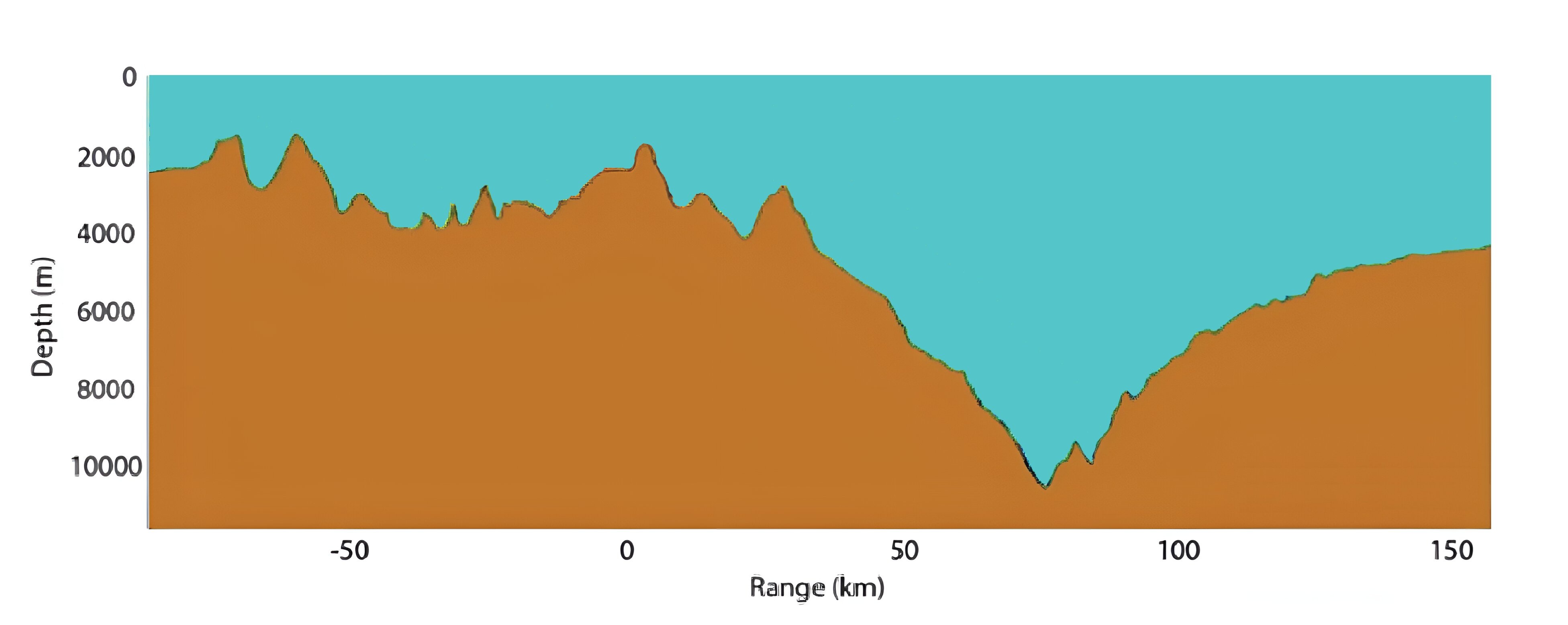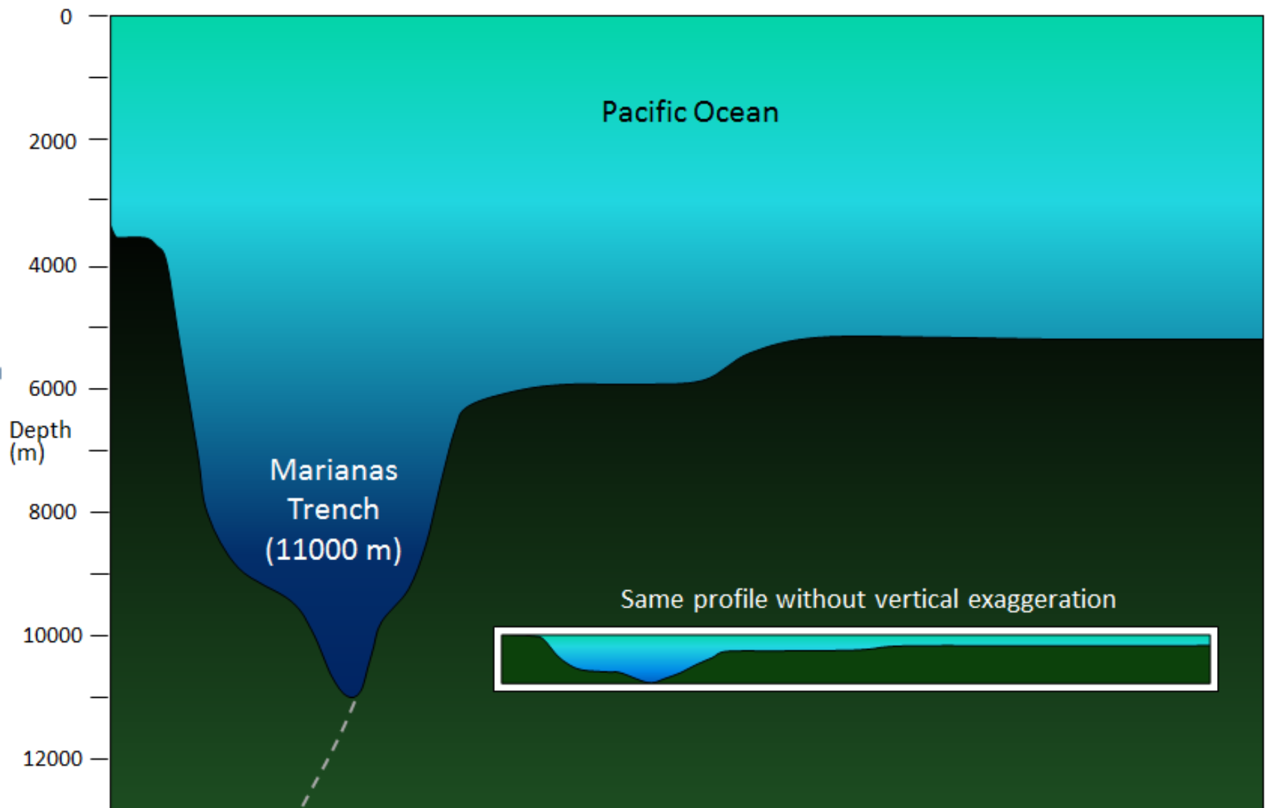 Рис. 26. Более подробная схема поперечного разреза океанического дна в зоне Марианской впадины на уровне Бездны Челленджера.[62]. |