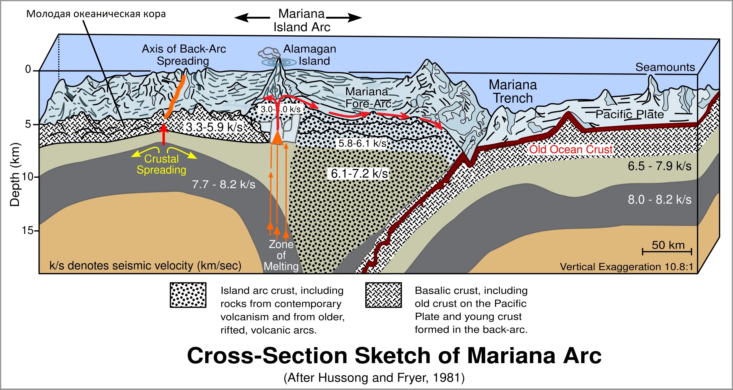 Парадокс субдуцирующих слэбов разрешается, если учесть, что в задуговой части Марианскоого бассейна (Axis of Back-Arc Spreading) расположена зона спрединга[63] с вулканической и тектонической активностью (см. рис. 27, 28), которая формирует рельеф этого региона земного шара: