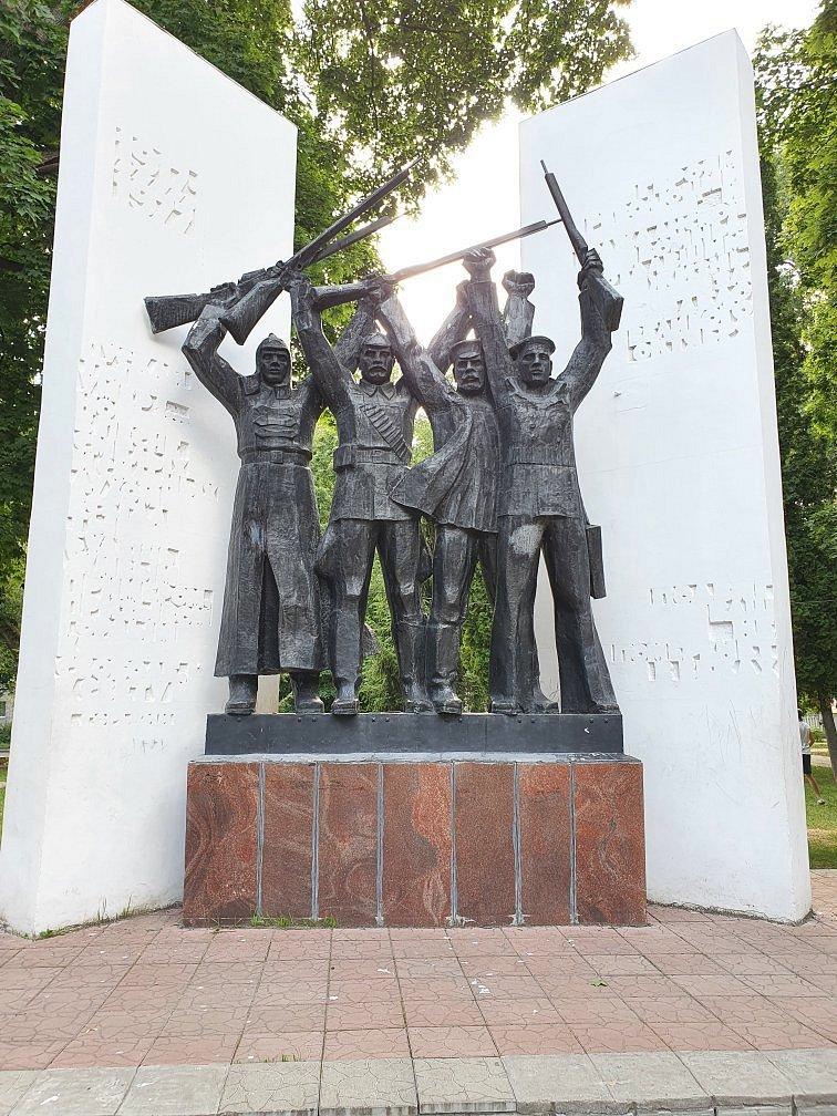 Мемориальный комплекс «Героям гражданской войны» включает в себя группу солдат и ополченцев (рабочих и крестьян), вечный огонь и братскую могилу, где захоронен прах сорока одного участника гражданской войны. В первом варианте группа солдат и ополченцев на вытянутых руках несла убитого комиссара. Вскоре появился второй вариант группы, в котором на вытянутых руках вместо убитого комиссара оказались винтовки, неестественно удерживаемые в горизонтальном положении.[6]