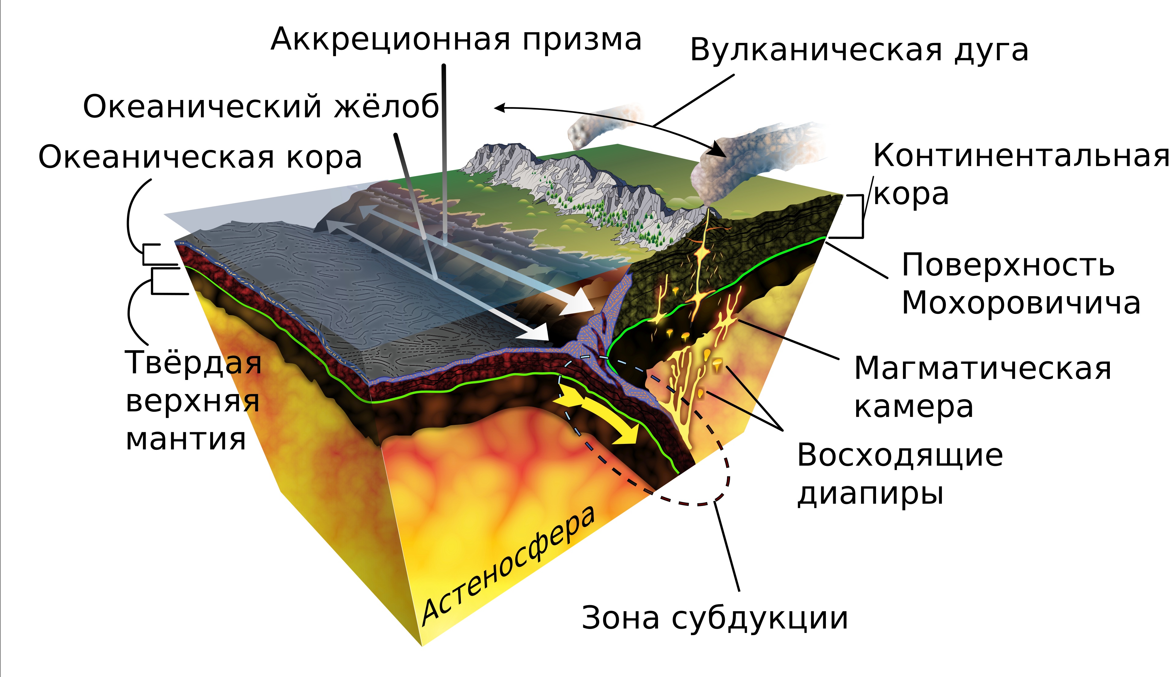 - ↑ 19,0 19,1 Субдукция —- процесс гипотетического протаскивания края одного блока земной коры под край другого блока в линейной зоне на границе столкновения литосферных плит, что приводит к дальнейшему расплавлению первого в верхних слоях земной мантии.