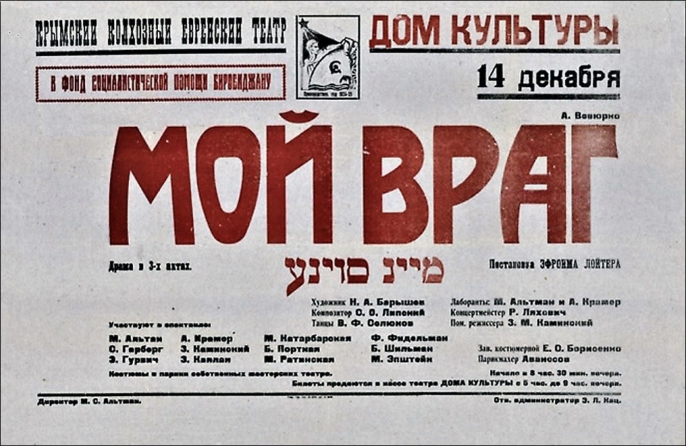 В 1933—1940 годах в Симферополе работал Крымский государственный еврейский колхозный театр. Он давал спектакли в еврейских сельскохозяйственных поселениях и городах Крыма.