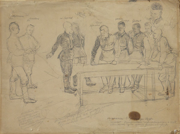 К картине существует эскизный рисунок (бумага, графитный карандаш; 33 × 43,5 см, по другим данным 31,5 × 43 см); по всему листу имеются многочисленные надписи с указанием фамилий изображённых лиц, а также комментарии и заметки по колориту, общей композиции и отдельным деталям будущей картины[6]. После смерти А. И. Лактионова, последовавшей в 1972 году, этот рисунок долгое время хранился в семье художника и 22 февраля 2007 года на торгах в аукционном доме «Совком» был продан в частную коллекцию[7].