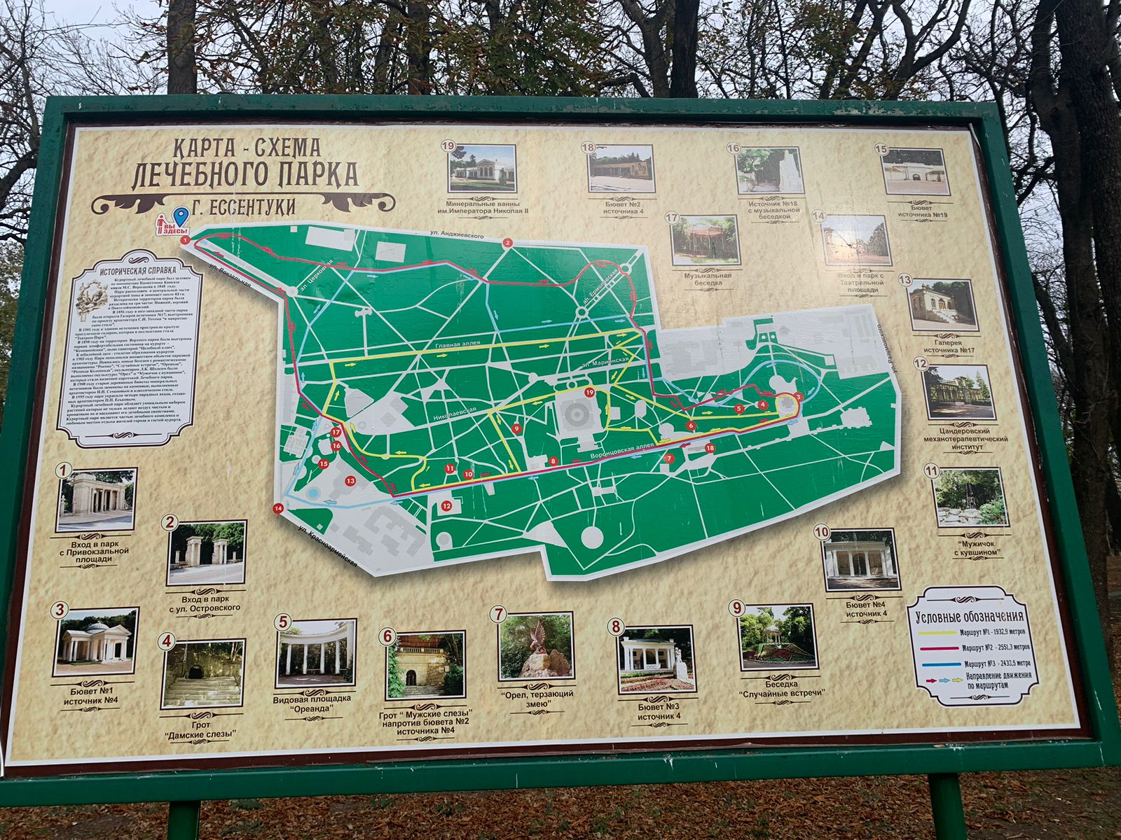 1 — Вход в курортный парк Ессентуков с Привокзальной площади. 2 — Вход в курортный парк Ессентуков с улицы Островского. 3 — Бювет № 1 источника № 4. 4 — Грот «Дамские слёзы». 5 — Видовая площадка «Ореанда». 6 — Грот «Мужские слёзы». Напротив бювет № 2 источника № 4. 7 — Скульптура «Орёл терзающий змею». 8 — Бювет № 3 источника № 4. 9 — Беседка «Случайные встречи» и клумба с надписью «Ессентуки». 10 — Бювет № 4 источника № 4. 11 — Скульптура «Мужичок с кувшином». 12 — Цандеровский механотерапевтический институт. 13 — Питьевая галерея источника № 17. 14 — Вход в курортный парк Ессентуков с Театральной площади. 15 — Бювет источника № 19. 16 — Источник № 18. 17 — Музыкальная беседка. 18 — Питьевой бювет № 2 источника № 4. 19 — Верхние минеральные ванны имени Императора Николая II.